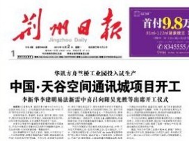 8月11日,荊州電視臺(tái)再次采訪并報(bào)道了華訊方舟科技(湖北)有限公司竺橋工業(yè)園和中國天谷荊州項(xiàng)目進(jìn)展?! ?bào)道稱,近兩年荊州的電子信息產(chǎn)業(yè)異軍突起,其中塊頭最大,投資最多
